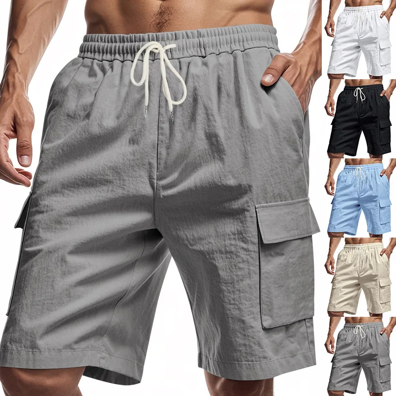 2026 Summer Men’s Casual Five-Point Pants Lightweight Breathable Linen Loose Cargo Multi-Pocket Shorts Drawstring Mid Knitted
