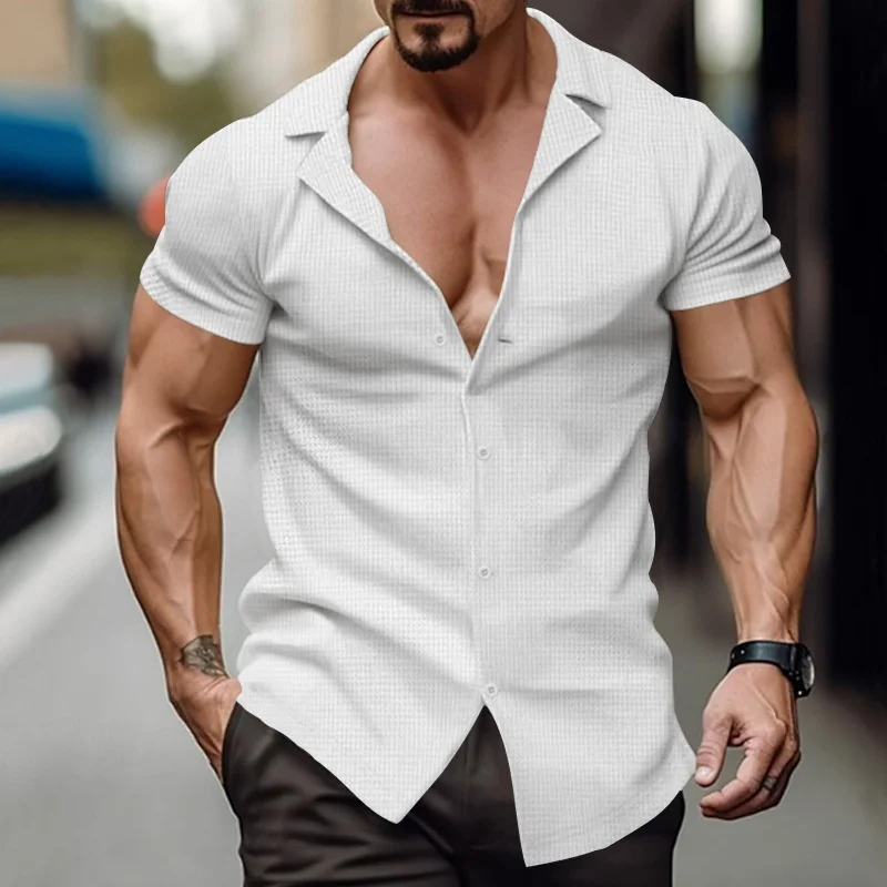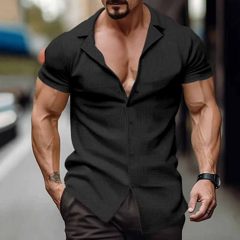 American Retro Simple Cross-Border Men’s XXL Size Short-Sleeved Casual T-Shirt Loose Casual Heavy Waffle Lapel Summer Casual 3D