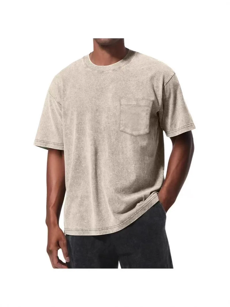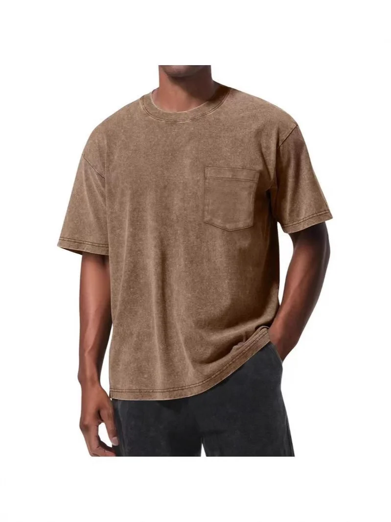 American Style Washed T-shirt, Vintage Vintage Distressed, Large Size European, Pocket Front Pocket Tshirt