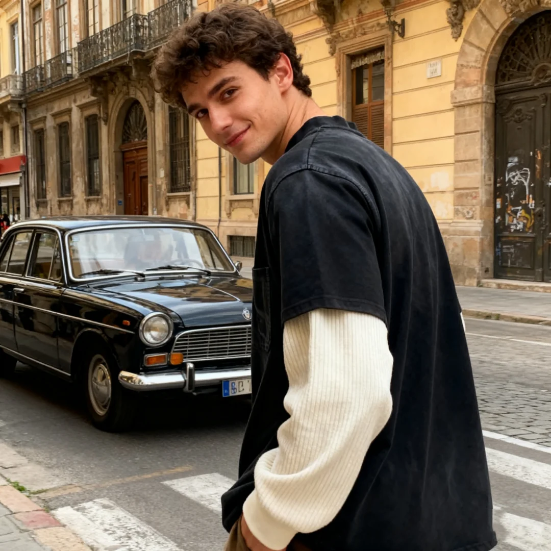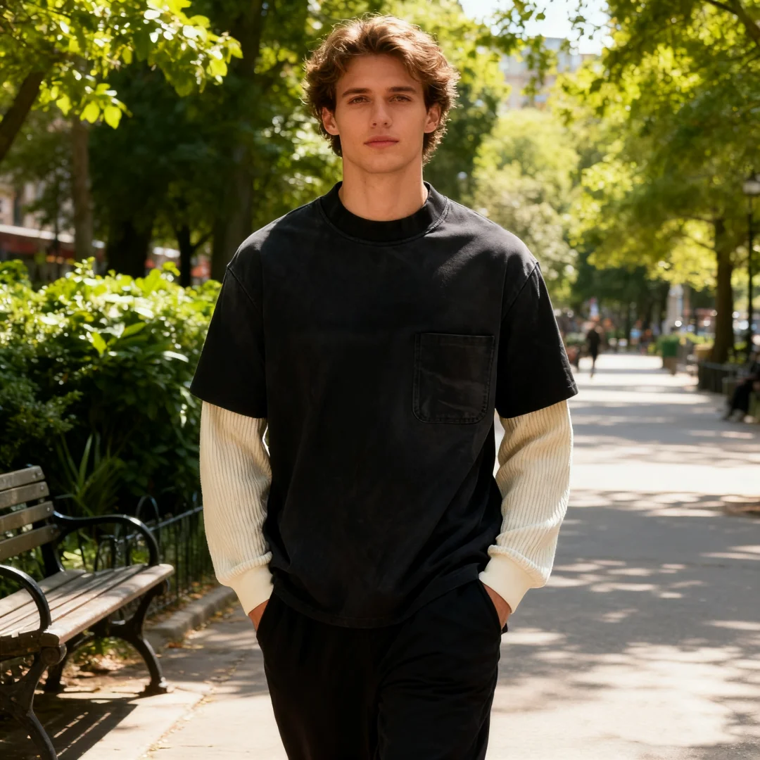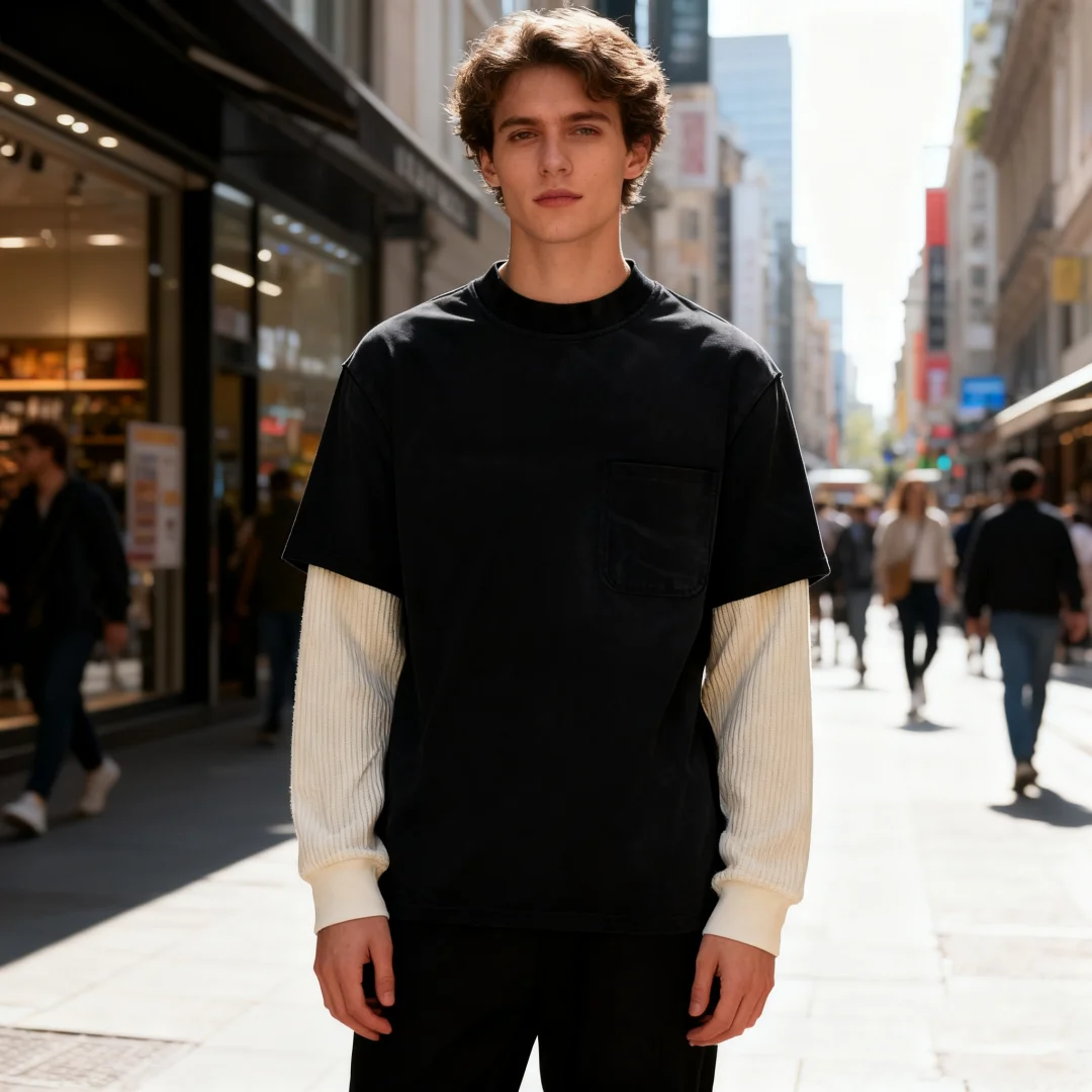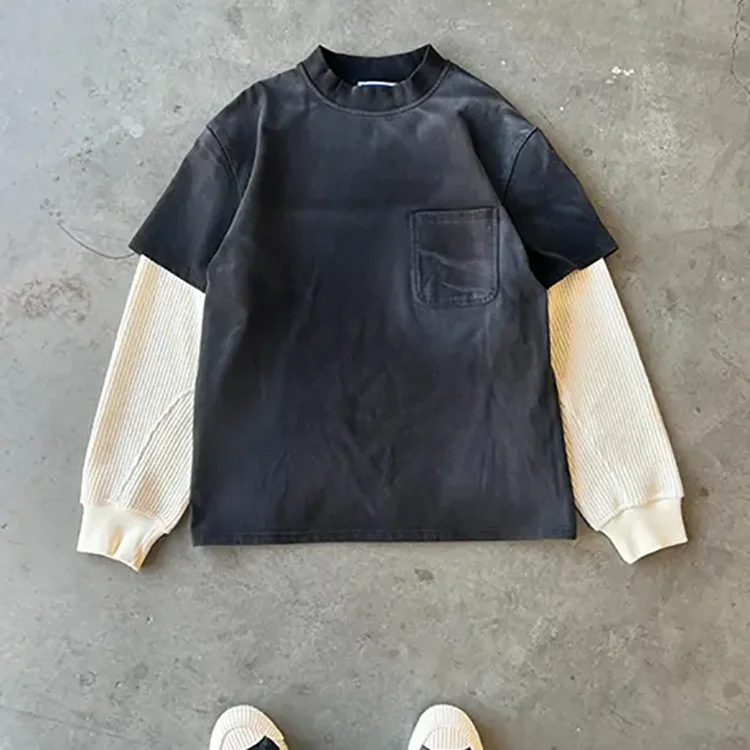 Oversized Waffle Knit Cotton Heavyweight Tshirt Acid Wash Sun Faded Double Layer Men Long Sleeve T-shirt